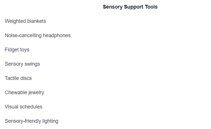 Sensory support tools can greatly assist individuals with autism in managing overstimulation and creating a more comfortable environment. These tools are designed to provide sensory input and promote relaxation. Here are some commonly used sensory support tools: